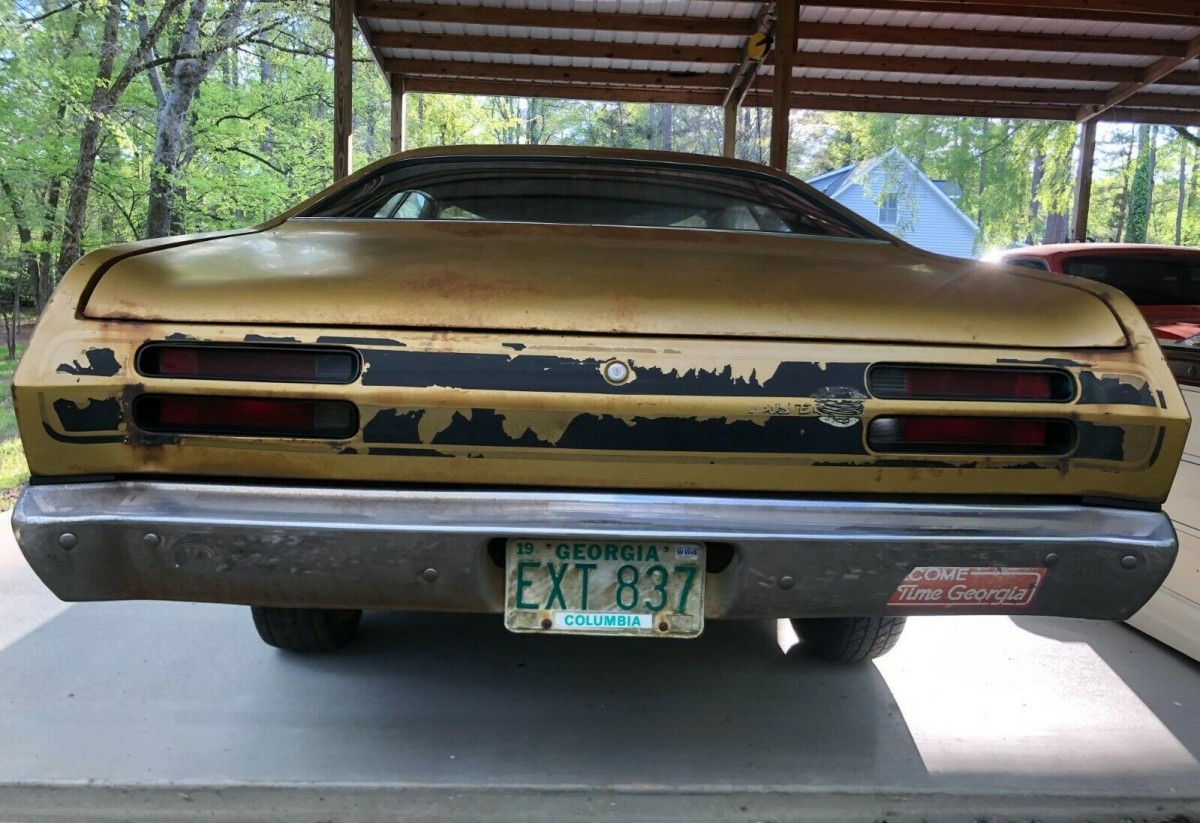 The history of the seller’s Duster goes back to when it was new and the family of a friend took delivery at a dealership in Augusta, Georgia. Though it was parked in 1984 and hasn’t run since then, said family continue to hold onto the automobile until recently. Other than consumables like tires, everything else about the Plymouth may be original. It continues to wear its factory Gold Leaf paint (code Y8) with black stripes, but the stripes are more worn than the paint.
