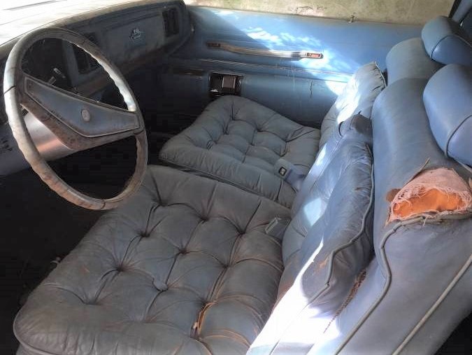Of the little information given, the seller says “good interior”. I wouldn’t go that far, but maybe fair. It has a big rip in the upper driver’s seat back, and some of the buttons are missing or loose from the tufted leather seats. The front seat is a split bench design. The steering wheel is cracked, the passenger door armrest is cracked, but the dash seems to have survived without any cracks so far. The interior could use a complete cleaning from the dash to seats to carpeting. The headliner appears to be in good condition.