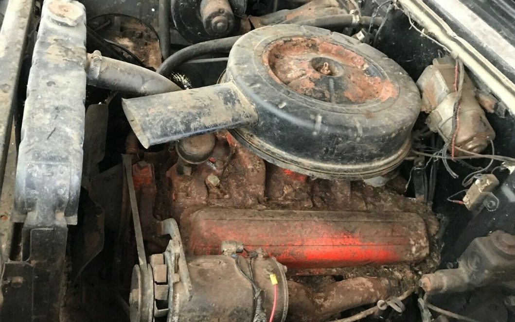 As for the interior, other than the floor shift, more originality persists. It’s worn and dirty, the instrument panel’s finish is peeling and the radio is missing (though it is in the trunk). It appears that the carpet/floor mat is missing as well, and there is a lot of surface rust including at least one rust-through hole spied. The rest of the interior is “there” but it could really use a complete remake.