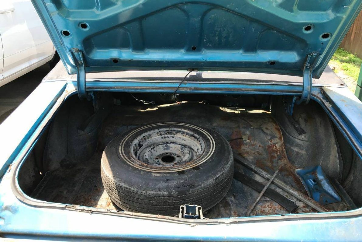 What can be seen of the trunk looks pretty solid, but who knows what’s under the spare. The jack is there too. No rally wheel for a spare. That makes me wonder if this car came with the standard steel wheels and dog dishes which were quickly replaced by a set of custom wheels like Keystones or Cragers.