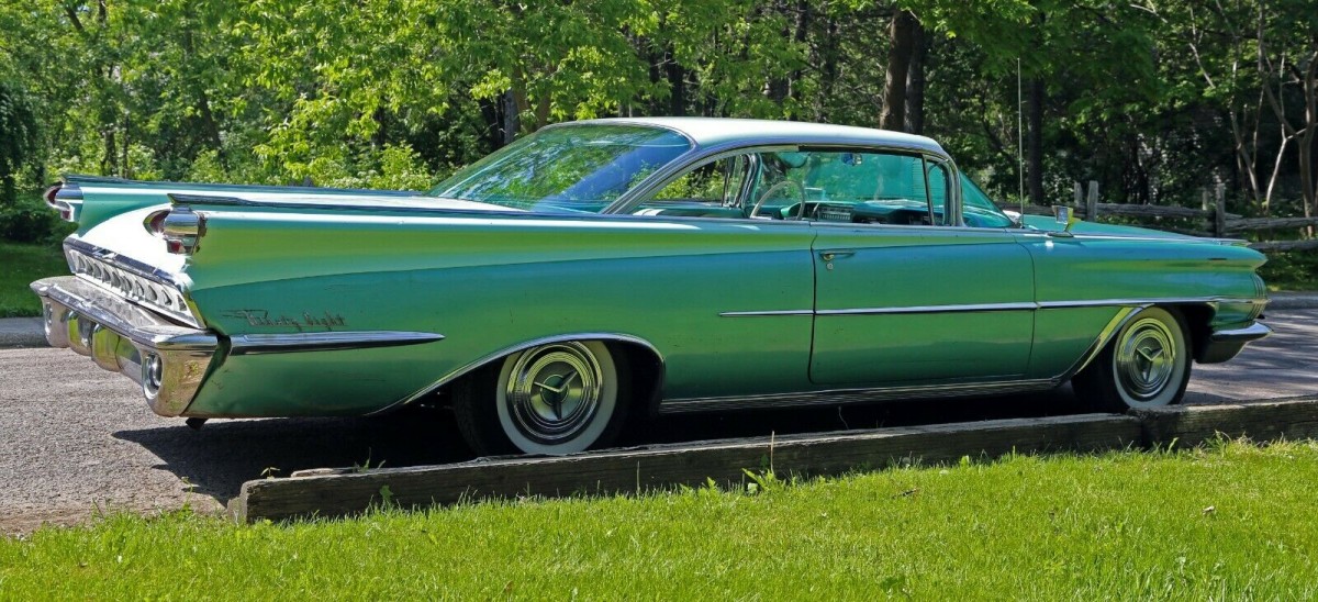 I’ve GOT to stop looking at these treasures. First was the maroon `60 Bonneville hardtop I want so bad; now this??! My eyes are being treated to such beautiful sights!! This, just the way it sits, IMHO is $25K all day long. I can’t believe how complete and original this is–right down to the color-coordinated spinner wheel covers! Sorry folks, all I can do is weep at not being able to snatch this. I sincerely hope it goes to a good home. This `59 deserves all the TLC an Olds lover can provide!! Good luck!!!