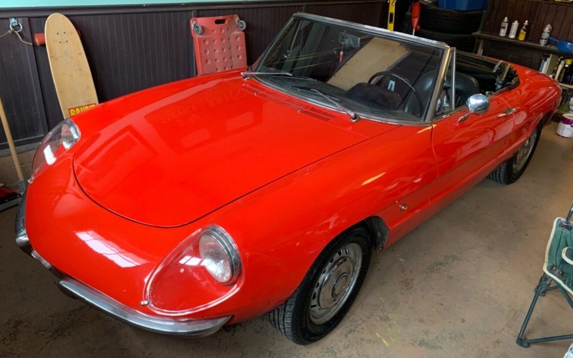 This is my favorite of the Duettos. Covered headlights, smooth tail with slim taillights and skinny bumper(ettes). My friend, and Company commander, had a light blue ’67 (in ’67) and he enlisted me to help clean and do mechanical work (yep, adjusting those cam chains) and then we’d head for the winding roads in our area of Germany. Great sounds, and very different from my monster high performance 390 Ford V8. Anyway, it was great when it was nice out, but I was nearly 6’4″ then and wouldn’t ride with him if the top was up. He actually managed to spin it off the road avoiding a worse accident and put it on it’s top in a ditch. Luckily for him the roof supports (at low speed) held and he walked away !