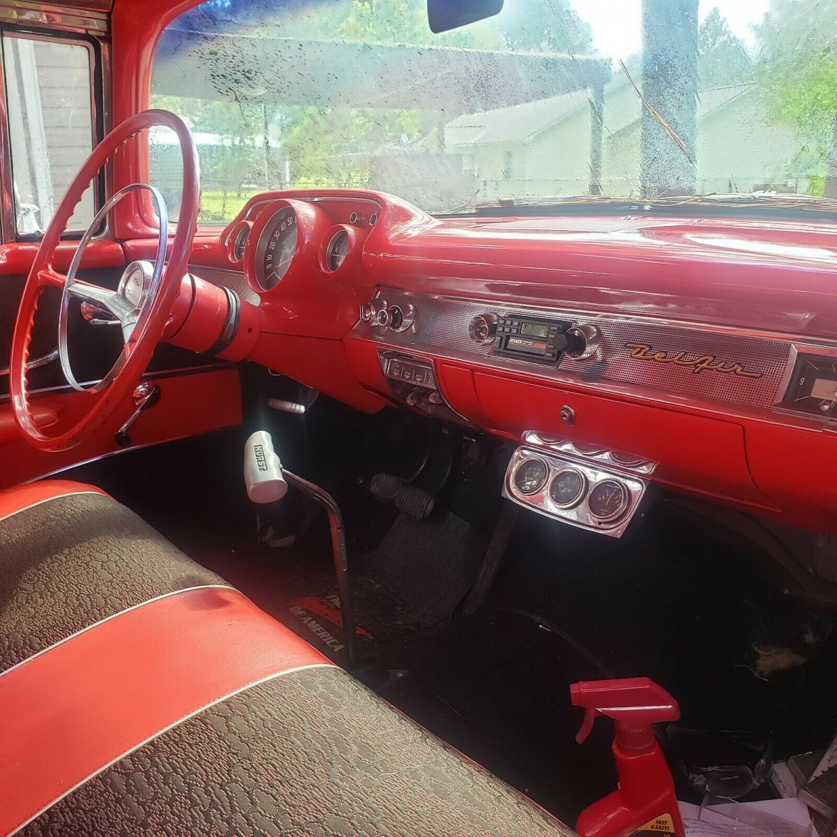The interior is one area of this Bel Air where the buyer won’t need to spend a dime. The seats and door trims are upholstered in the Code 669 combination of Red and Black, and the surfaces look flawless. There is no evidence of wear or physical damage, and the Red headliner is equally impressive. It appears that the carpet is in good order, there is no appreciable wear on the wheel, and the painted surfaces shine impressively. Aftermarket additions include a Hurst shifter, a Jensen radio/cassette player with speakers in the rear parcel tray, and a gauge cluster to monitor the health of things under the hood.