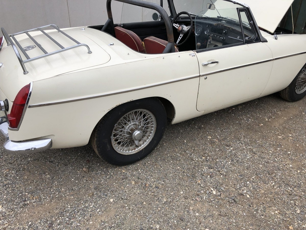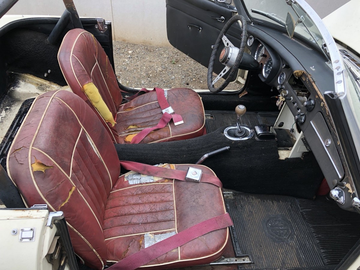 The interior needs total replacement, but not to worry: the seller has acquired all necessary pieces from Moss Motorsports and they are included in the sale price. The new interior is red, matching perfectly with the creamy white original color. The radio is missing but is clearly seen in the extensive collection of photographs that can be accessed here.