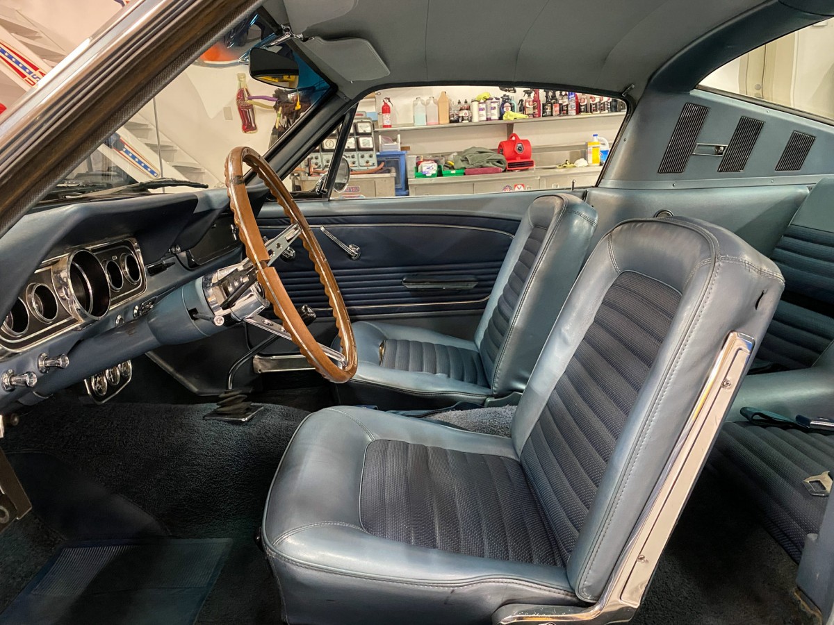 I think it would look awesome with a dark blue exterior. My father bought a Mustang coupe new, in 1966, and it was our (only) family car for over 4 years. Candy apple red, black interior, 6 cylinder and three on the floor. Neat little car, but not much room for growing kids in that back seat.