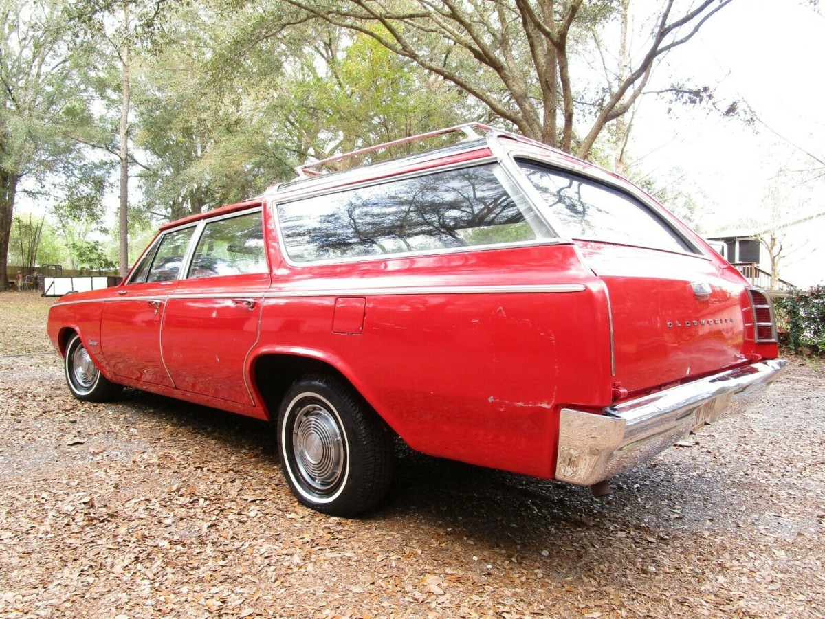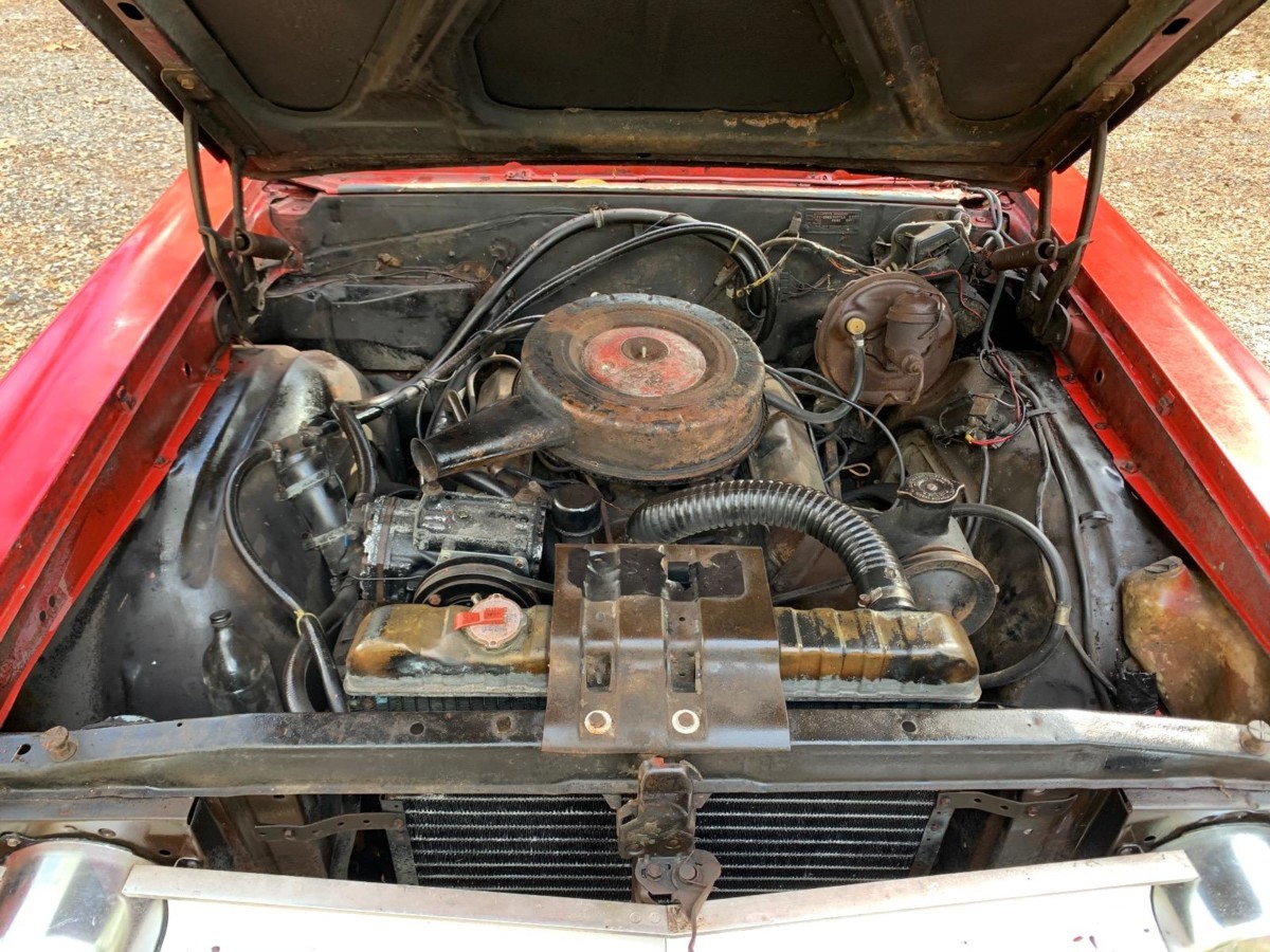 The Oldsmobile is finished in Holiday Red, and while the color is original to the car, it has received a repaint at some point. It doesn’t look like this was completed to a particularly high standard, with cracking and overspray showing in plenty of locations around the vehicle. What is in relatively short supply is significant rust. The front edge of the hood has some noticeable rust, while there are small areas visible around the fuel filler door, under the top chrome on the tailgate, in the bottom corner of the driver’s door, and a few small spots on some of the outer edges of the wheel arches. I’ve looked closely at the photos and am undecided whether there is rust on the inner edges of the doors, or whether it is some form of sealer that has been exposed by the cracking paint. It appears that the lower regions of the body like the lower rear quarter panels and the rockers are solid, while there is no significant rust around any of the windows. It’s when you take a look under the Olds that you get a pleasant surprise. There is rust in the spare wheel well, but the rest of the underside of the vehicle appears to be as solid as a rock. The glass generally looks good, especially the glass panels in the roof, and while the majority of the trim and chrome is present, there are a few pieces that will require restoration or replacement.