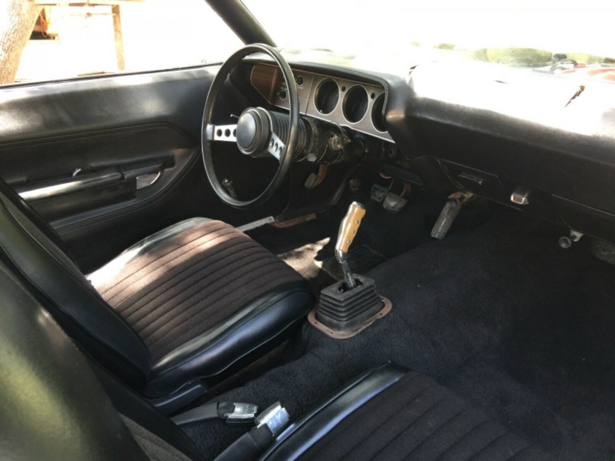 The interior doesn’t look like it is going to require huge amounts of time or money to whip into shape, because it already looks to be pretty nice. It’s a bit hard to tell because of the way that the photos bleach out, but I think that there might be some cracks in the dash pad. The original factory radio is missing, the upholstery on the bucket seats isn’t original, and the boot around the bottom of that awesome “pistol grip” shifter will need to be replaced. Otherwise, everything looks really good, and the rally pack gauges, complete with factory tach, all appear to be in great condition.