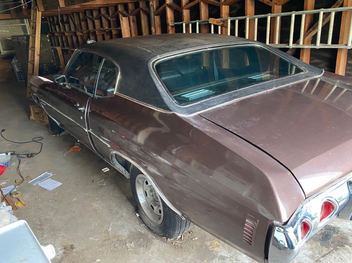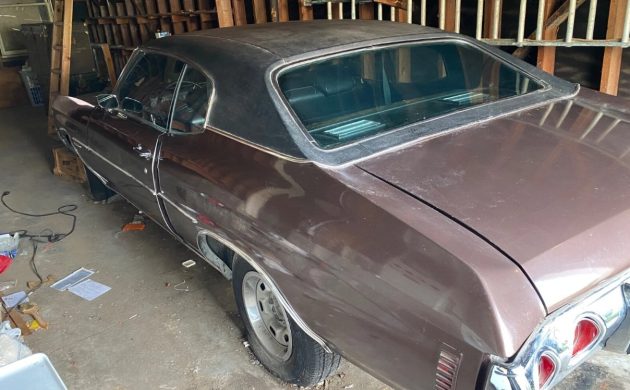 Chevrolet performed little more than a cosmetic refresh on its existing Chevelle range for the 1971 model year, with the grille, bumpers, and lights as its primary focus to differentiate it from the previous year’s offerings. The original owner ordered this ’71 Malibu in Rosewood with a Black vinyl top, creating a classy look. The car saw active service until they parked it in this shed in 2001, and it hasn’t moved an inch since. The car’s location and history are both good news for potential buyers, allowing the Chevelle to avoid the underside rust issues that often plague these classics following long-term exposure to adverse conditions. The seller claims that this beauty is rock-solid, although there is a downside that has left its mark. The garage is pretty dry, but there has been a water leak that has impacted the roof, hood, and front bumper. It seems to have cracked the vinyl and lifted the bumper chrome. However, with the rest of the exterior appearing to need nothing but a wash and a polish, addressing these areas while leaving the remaining surfaces untouched might be viable to protect the Malibu’s survivor status. Alternatively, performing a cosmetic restoration should be fairly straightforward.