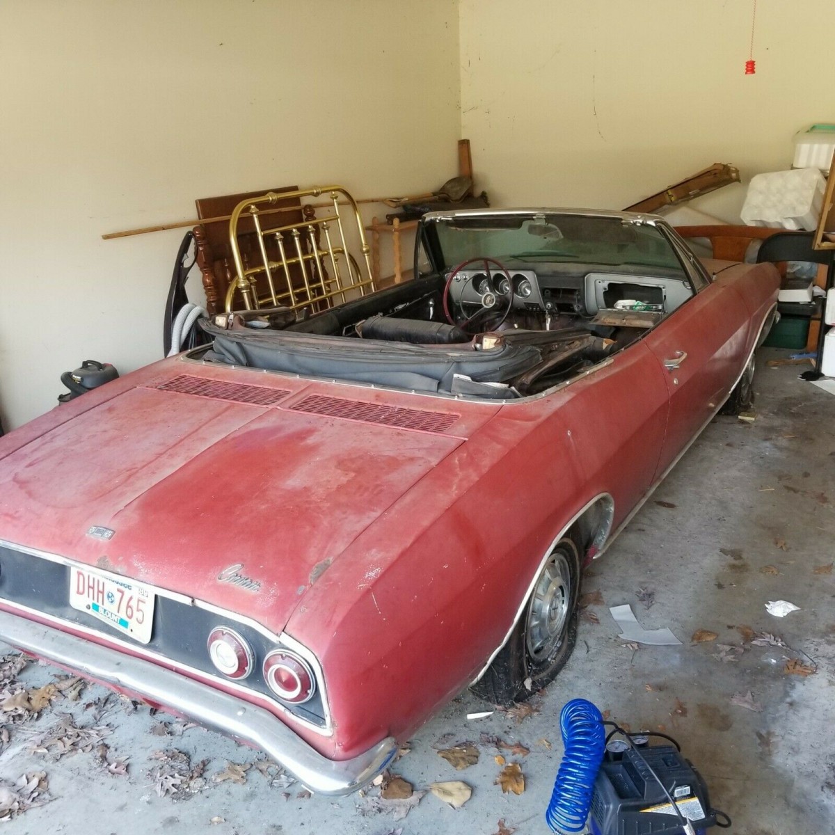 When it was introduced, the Corvair represented a radical departure for American automotive engineers. The initial aim was to compete with budget imports from the likes of Volkswagen, so why not follow their philosophy from an engineering standpoint? That meant an air-cooled horizontally-opposed engine mounted in the rear. This also led to interesting styling cues, and while the 1st generation cars were seen as quite boxy and frugal in design, the 2nd generation brought with it some flair and a svelte appearance. This is one of the cars from that initial year of 2nd generation sales, and I still think that it is an attractive car after 55-years. It was parked in 2003 and has only recently seen the light of day once again. It wears Regal Red paint, but originally rolled off the production line finished in a color called Evening Orchid. That was a color that was available in the Corvair range for a single year, and it isn’t clear why the color change occurred. From a personal perspective, I would be sorely tempted to return the car to its original color if I was restoring it because it would certainly make it a standout wherever it went. The panels look to be very straight, but the Black convertible top has certainly seen better days. Apart from surface corrosion, rust is surprisingly minimal. The floors wear heavy corrosion, but only a couple of minor rust holes on the passenger side which could potentially be addressed with patches. There is also some rust at the base of the windshield, and treating and repairing this could be a bit more complex. Still, it doesn’t look like it has advanced too far, so it might be a case of catching it early. There are also some spots around the front wheel well on the driver’s side, but that appears to be about it because the rockers and rear quarter panels look very solid. The trim and chrome is all present and in a restorable state, while the tinted windshield is free from any obvious damage.