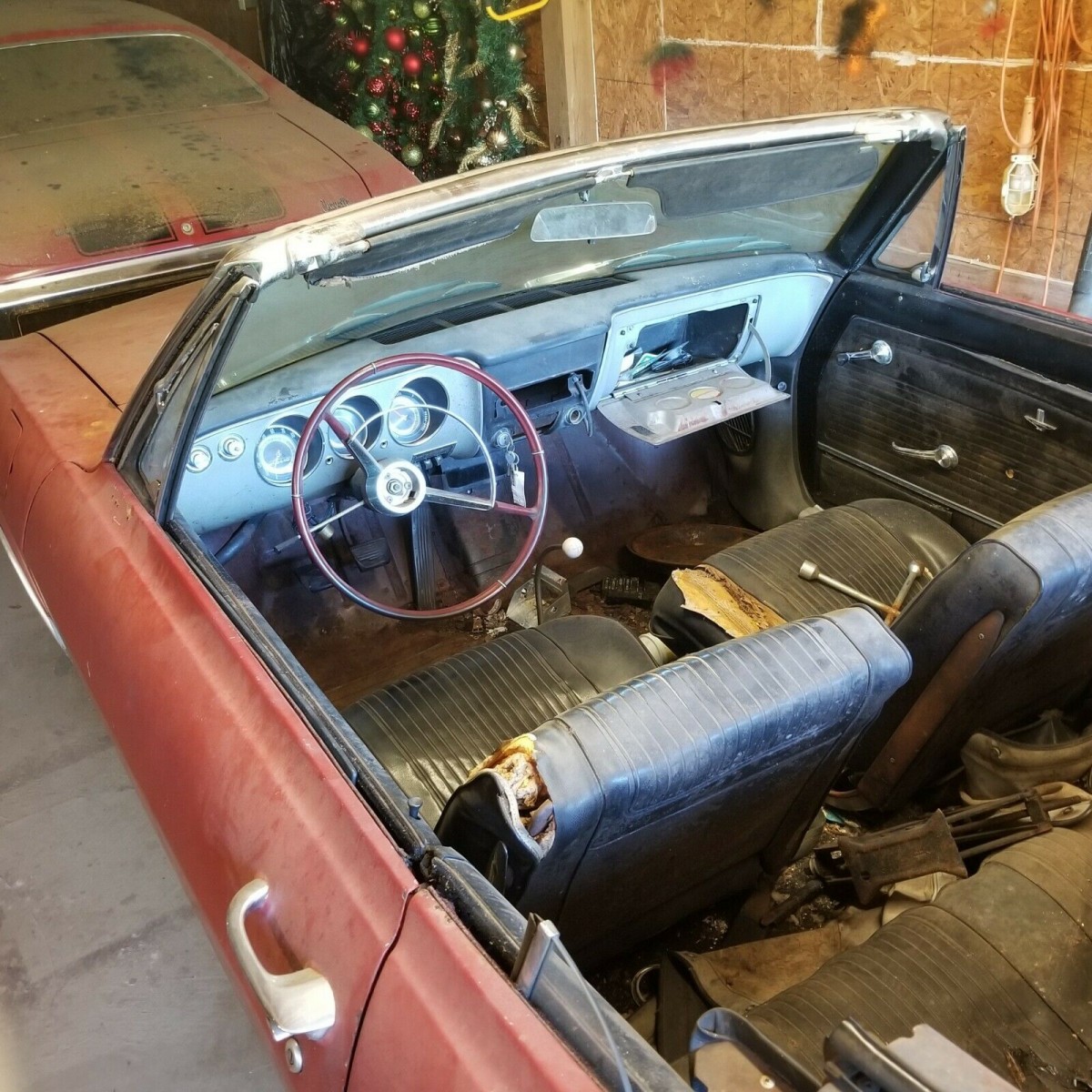 When a convertible has been sitting in a shed for the best part of two decades with the top down, it is only fitting to expect some notable deterioration of the interior trim. That is the case with this Corvair because it will require a reasonable amount of restoration work. The seats will need new covers, the floors will need new carpets, and what remains will need some fairly thorough cleaning. The center is missing out of the wheel, the radio is gone, and the next owner will need to source new armrests for the doors. The dash and pad look like they are in good condition, but when I look at the wheel, I do notice something interesting. With the Corvair originally wearing Evening Orchid paint, the black interior trim comes as no surprise. What does seem odd is the fact that the wheel appears to be red, which is an appropriate match for the current paint color. That’s not the color that I would have expected with the original paint, and it makes me wonder whether the wheel has been changed at some point. It isn’t anything significant but it is just a point to ponder. Hopefully we have a reader who is an expert on the Corvair, and can enlighten me on that one.