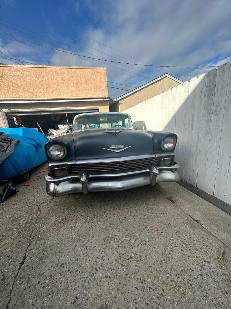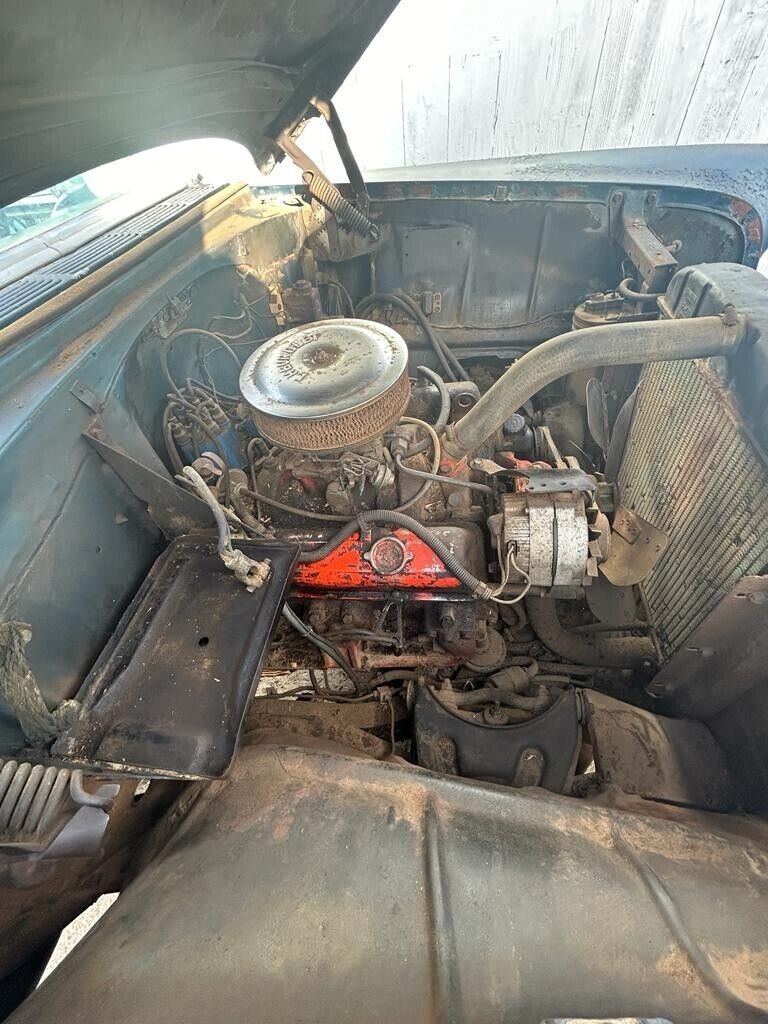 Boy, can you say 1980s? B&M shifter, 350 engine, radio and EQ and those awful wheels. Even the colors don’t look exactly 1956. Well, maybe ’57 Harbor blue. Overall it looks like a good place to start based on seeing it’s good side. There seems to be a lot more to know.