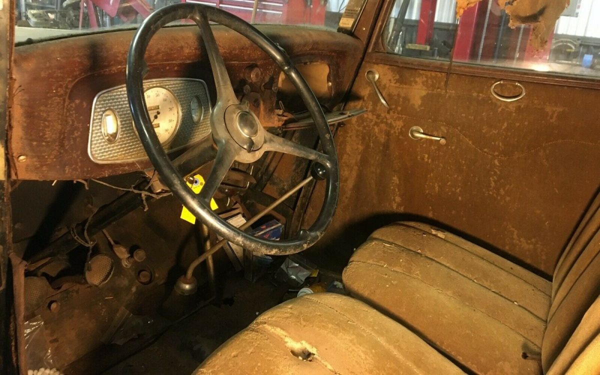 The interior is about what one would expect, it’s ratty and deteriorated but not terrible. The fabric seating upholstery has ruptured in places, the dash is wearing a patina of surface rust, the door panels appear to be slowly disintegrating, and the headliner is gravity-bound. It sounds bad, but it’s really typical old car stuff – there’s no doubting the originality. The simple instrument panel is still surprisingly clear.