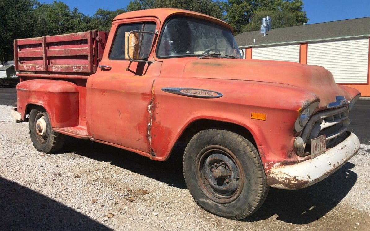 Hey, how about another ’57 Chevy? You know, the third and final member of the Tri-Five triumvirate? Well, here you go, a ’57 Chevrolet 3600 step-side pickup. Yeah, not what you were expecting but maybe one that you would prefer to review. This Chevy truck is located in Wahoo, Nebraska and is available here on eBay for a current bid of $4,050 with seventeen bids tendered so far.