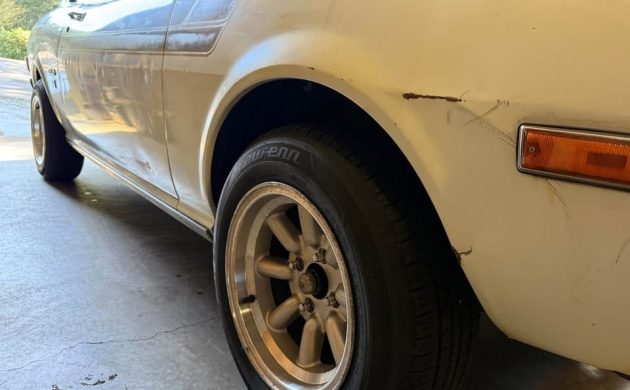 Our subject car is a model RA22, which is a two-door coupe; a liftback version was available as well. Trim levels included the ST (our subject car), GT, and new for ’75, and LT. The seller tells us that this example sat in dry storage from 1987 until recently, when it was “brought back to life“. It shows pretty well with no indication of rust, but there are some scrapes, dings, and contusions – and a lot of fade to the sport stripes. Still, the white finish is reasonable, and the Minilite-like wheels are an uplifting addition.