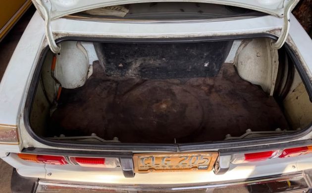 Inside is a typical seventies’ Japanese car environment – lots of plastic but solid workmanship – and in this case, it has all held up well. The seating upholstery, door panels, and dash pad are not indicative of heavy wear, water intrusion, or sun damage – its long slumber must have been in a dry, protected environment. The steering wheel has a crack at twelve O’Clock, but that’s not unusual. If you will notice the instrument panel, it’s of a slightly concave design, intended to create a driver-centric feel and remain separate from the passenger portion.