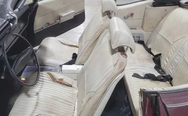 “As goes the top, so goes the interior” is often how things shake out with convertibles, but in this case, some amount of indoor storage has helped preserve what could have been complete interior destruction. The vinyl upholstery in this bucket seat-equipped droptop is split, but the dash pad has remained surprisingly intact. The instrument panel itself still shows pretty well, but we know what lies beneath the carpet is compromised.