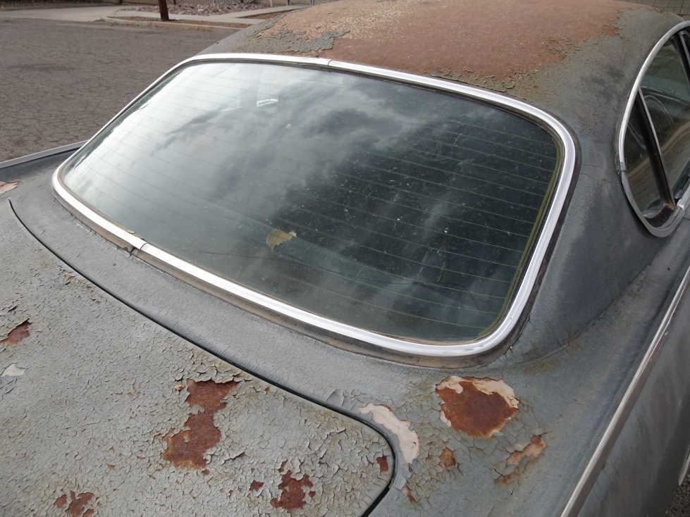 The paint has damage from the rather arid areas it lived in, and the seller mentions that despite the patina and some minor surface spots, it is doesn’t have any serious rust problems. The chrome exterior trim has some imperfections, a dent in the rear bumper, and the seller notes that the exterior may have received body repairs at some point in its past.