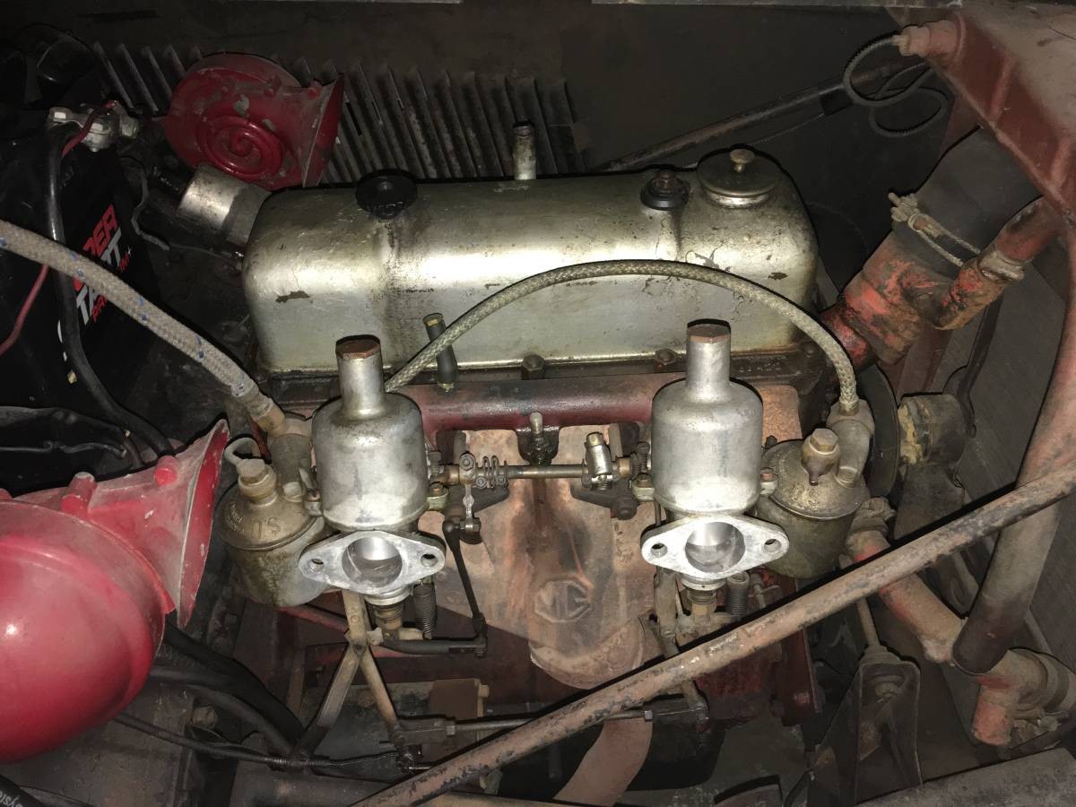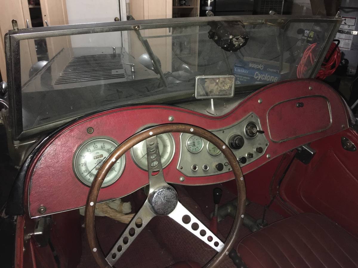 Wire wheels were available from dealers only after TD production had ended and the TF (which could be ordered with wires from the factory) was being made. The handbrake boot is not original, nor is the carpet.
