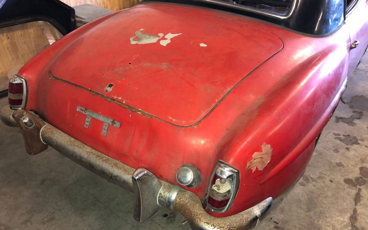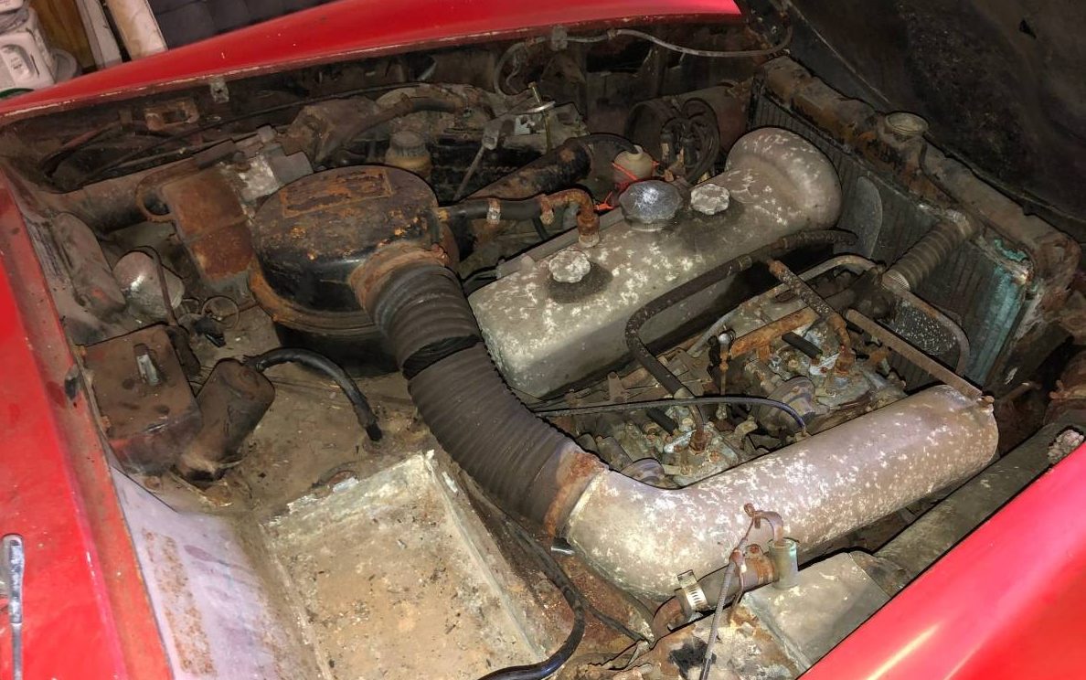 The interior is in fair shape but it’s moldy – evidence of poor storage. Nevertheless, the tan seat upholstery probably needs nothing more than a thorough cleaning. The instrument panel is interesting in that it is finished in a hue of dark red that does not match the exterior, perhaps something related to the seller’s claim of an earlier restoration. From what can be seen of the instrument panel, it appears to be intact with the exception of one, unoccupied opening in the glove box door, probably the clock’s location. The carpet is all in place but pulling it back to get a look at the floors would be a worthwhile effort. The seller mentions that the hardtop’s original headliner is in good shape; there is an accompanying image to support this claim.