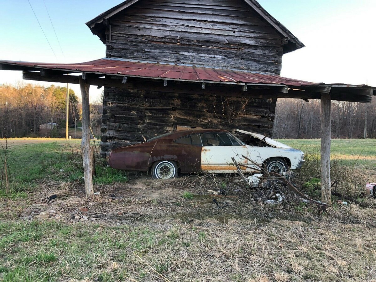 Technically, a “lean-to” find, big difference. Cars under lean-to’s for years don’t fare much better than cars outdoors, as evidenced here. The fender badge says 327, but who knows. What a mess,,but,,,it is a ’67 Chevy 2 door, and you have to start somewhere. With 0 bids, doesn’t look like it’s going anywhere soon.