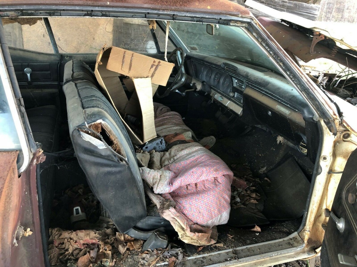 @Gaspumpchas U can see plenty of the passenger side if’n you open the eBay listing. One can almost smell the bird droppings through the computer! So looking at the interior this is an air conditioned car, dash pad looks perfect. Riding on Buick Riviera wheels. Looks like it was someone’s baby for a little while. Never realized without the end caps on the rear fenders and taillight panel how much this body looks like a Pontiac Catalina or Bonneville from the same era.