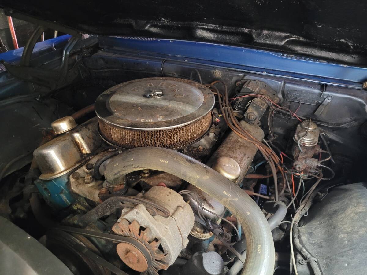 Don’t want to say it wasn’t in a flood, but the interior can look this way just being in a garage without AC. would look a lot better if they would have pushed it outside to wash it and clean the interior. Pics in the sun would probably help too. I agree on the engine placement looking odd. Also it has an incorrect license plate light assembly. jack holding up the right side maybe because of a bad tire. Vinyl top is probably hiding some issues. No console, automatic on the tree, I’d probably pass on this one unless it was running and driving at this price. who knows if there’s fuel in the tank and how old it is. A good bit of work to get her back on the road again.