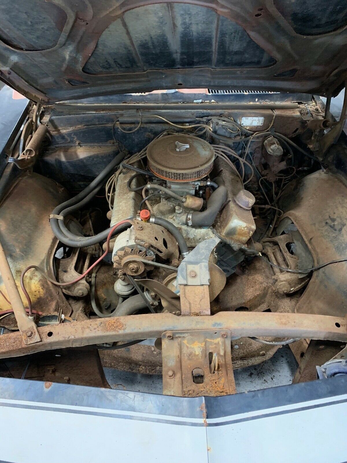 Hmm u guys think it went for a swim? Rusted out hood. nothing on there that you cant get. Once you get pickin’ away on the carbuncles under this baby you might be thru it. Possibly sat on a dirt or wet floor? Not for the faint of heart, while you got the tranny out make it a 4 speed. Good luck to the new owner!!