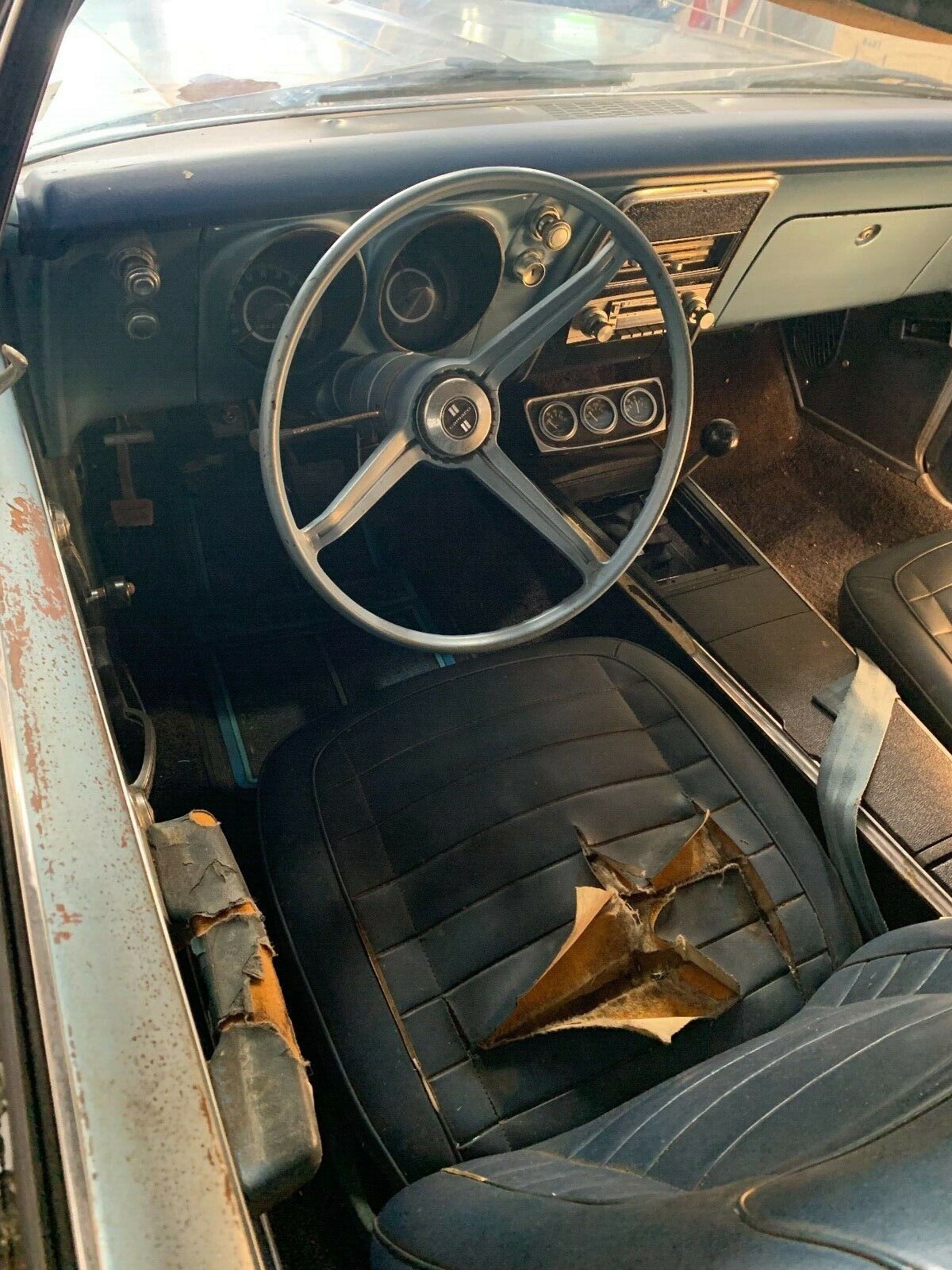 Under the hood is a V8, and while the owner doesn’t tell us much, I believe that this is the 210hp version of the 327ci engine. This is backed by a 3-speed manual transmission. It isn’t clear whether the engine turns freely, but the sheer quantity of rust on the belt pullies suggests that the engine hasn’t done much for quite some time. The radiator is also missing, and since I couldn’t see it in the car (and it certainly isn’t in the trunk!), I would assume that a new one will need to be sourced. The owner has fitted the Camaro with new front tires, but I think that they will probably just make it easier to roll the car onto a trailer at this point in time.