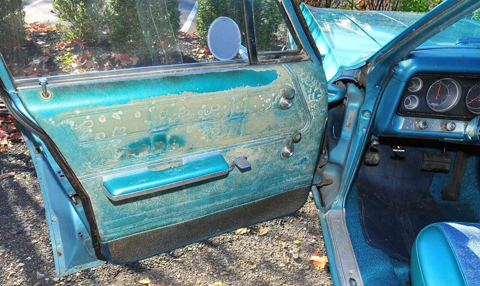 I think that this car was under water at one time.all that on the door pads and at the back of the front seat is mold and I am sure that it smelled when they opened up the doors.may need more work than bargained for.