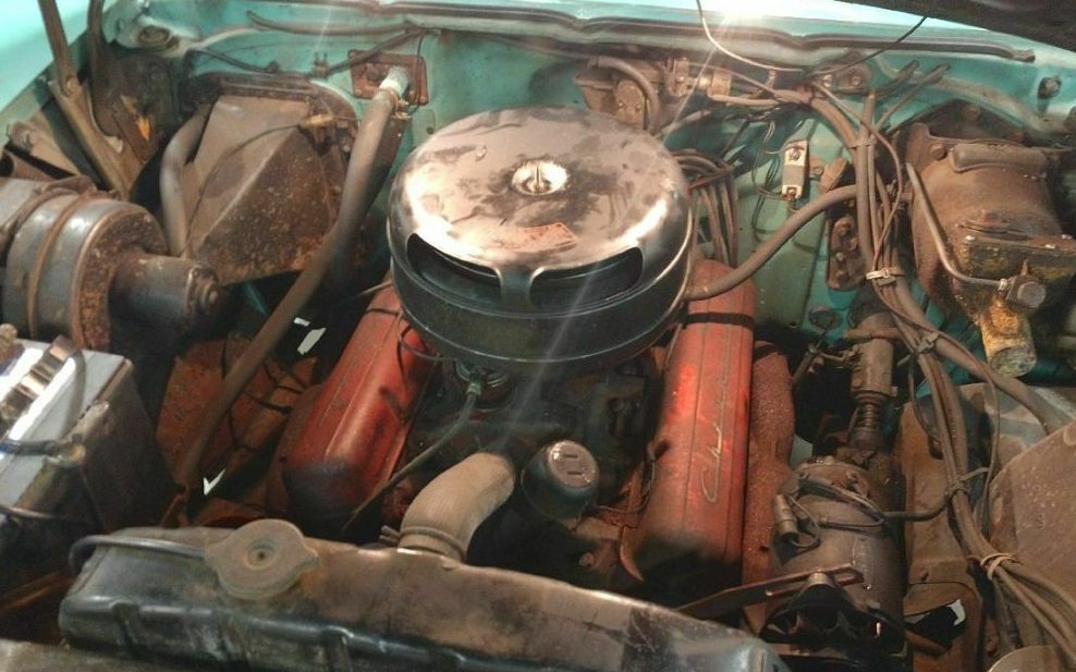 The engine compartment is probably the biggest drawback to this car. You can see it has clearly sat for a while and needs a freshening up to match the rest of the package. The engine is a 283 2-barrel and the seller says the oil is old but clean. The seller cleaned out the fuel line and added fresh gas. It now fires up and runs well although the radiator has some leaks and the water pump is noisy.