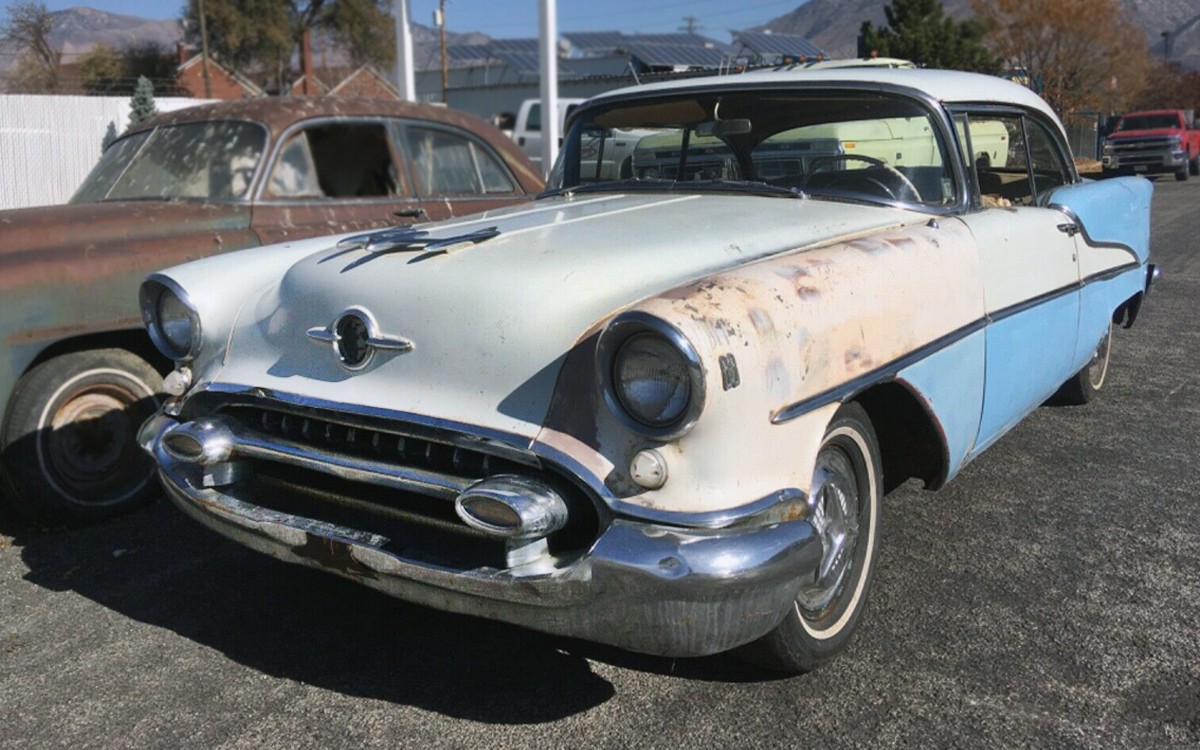 My Dad had a solid white 1955. About 1967, he sold his to a fellow gearhead who turned it into a tire melting hot rod. I don’t remember if he swapped engines, or hopped up the Olds engine, but it made a huge impression on me as a seven year old when he backed it out if his shop, and lit the rear tires up effortlessly!