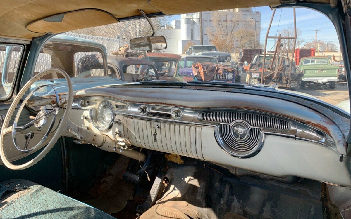 Our neighbor had a 1955 Olds parked behind his house down a hill by his garden and my brother and I used to play in it as kids back in the late-60s/early-70s. The interior on this car will need a lot of help to bring back the former glory. The dash appears to be complete but it’s in rugged shape and the seats are a mixture of gray and white with a front seat bottom that’s a different fabric in blue. I’m not sure what’s going on there? Then again, the door cards are blue and white so maybe the back seat and front seatbacks were replaced at some point? Confusing.