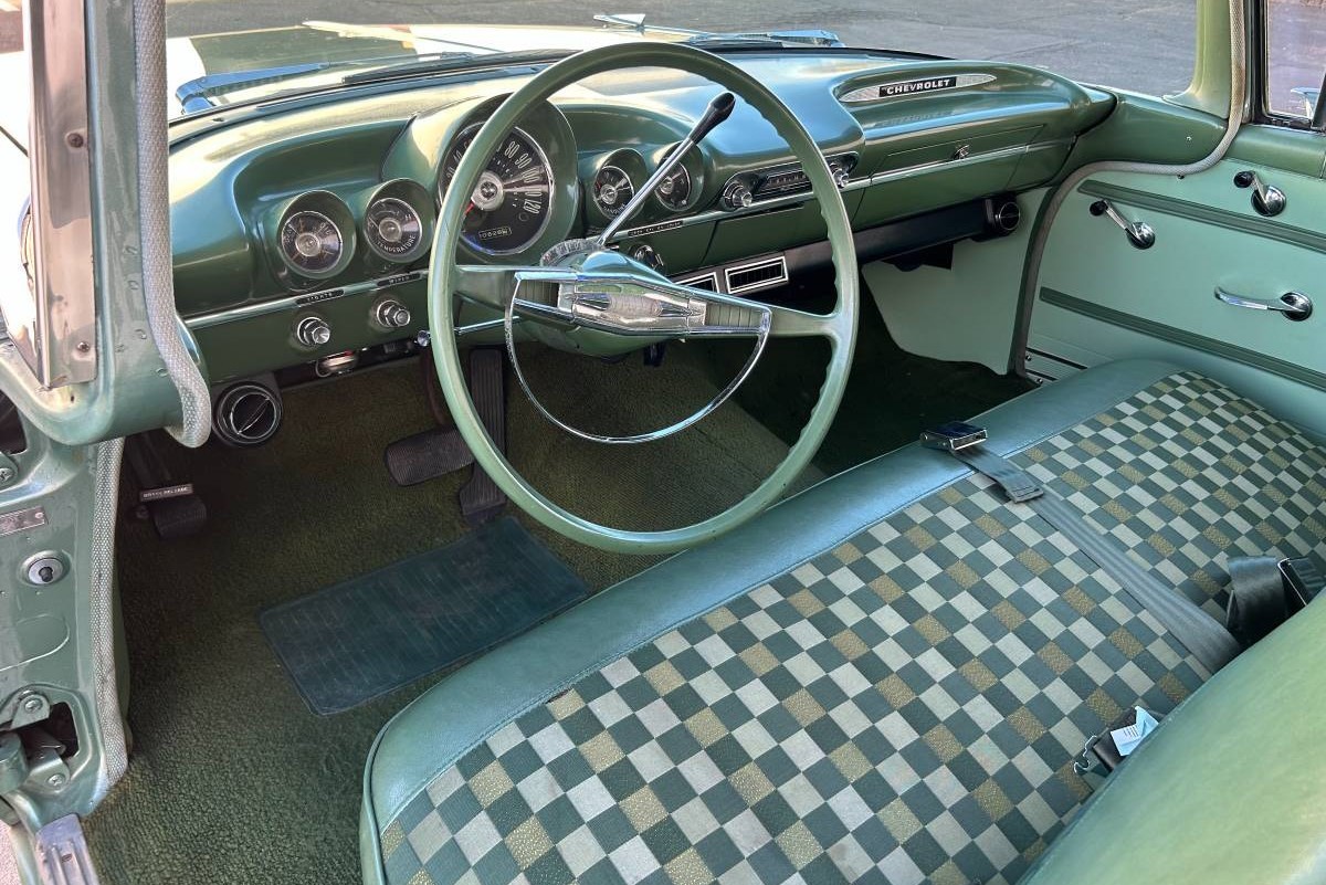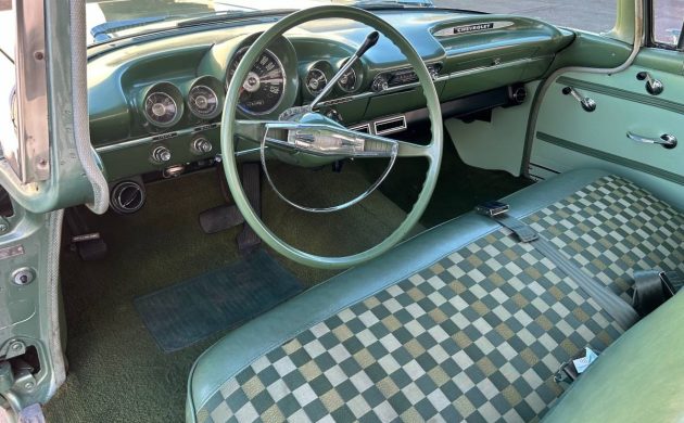 We’re suggesting this redo is a restomod because of the upgrades that have been made to this Chevy. They include the small-block V8 (not the original 283?), automatic transmission (not the original Powerglide?), vintage air conditioning, HEI ignition, Fitech carburetor, and a conversion to power front disc brakes. So much of this Bel Air is arguably better than in 1959. The Highgreen Green paint looks beautiful and the interior is indicative of the decade that was the ‘50s. If you’re in the market for a bat-wing Chevy, you could do a lot worse.