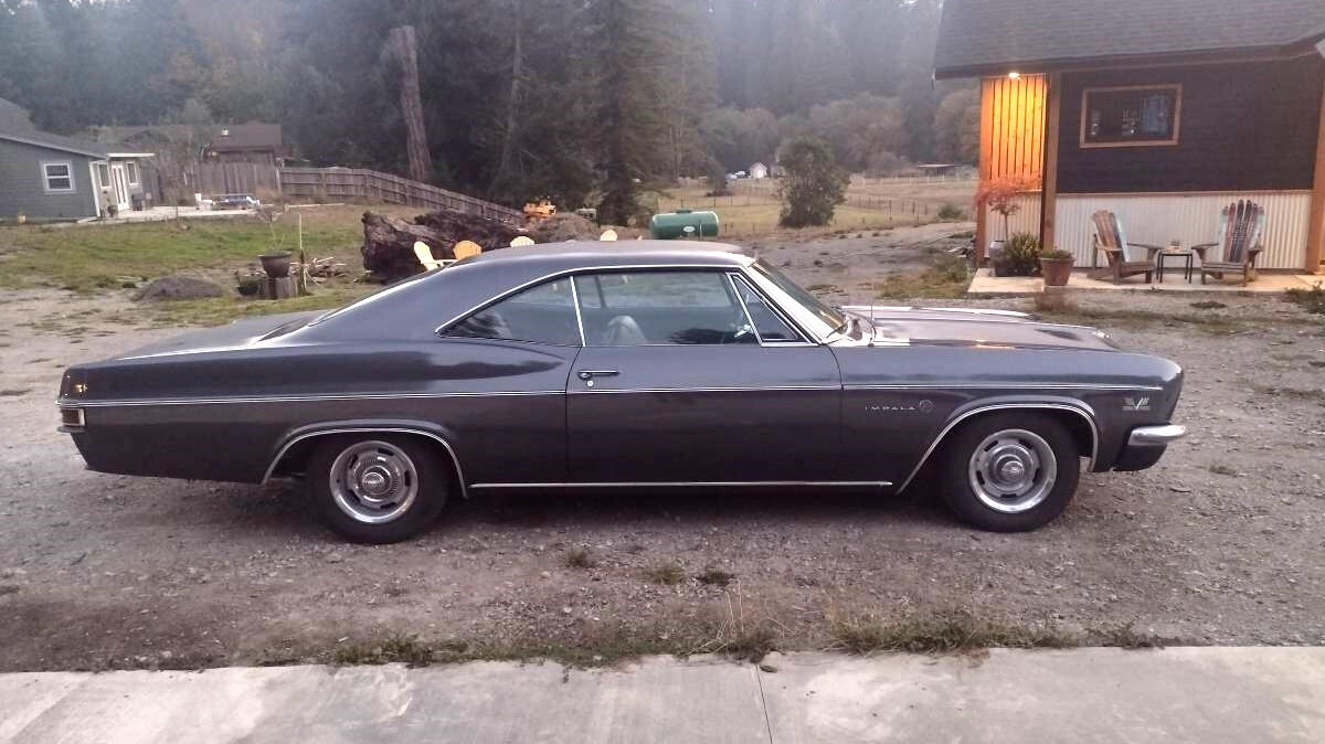 My mom and dad ordered a new 1966 base Impala with the 325 hp 396 and a Turbo 400 automatic. AM radio, two-tone paint – a black painted roof over silver, black vinyl bench seat interior, single exhaust, wheel covers.