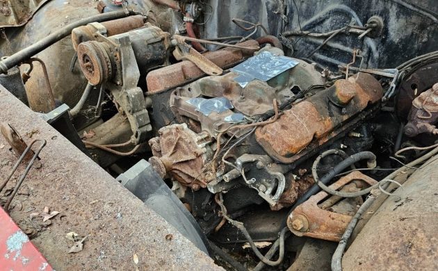 The seller doesn’t share any photos of the convertible car without the tarp covering the top, but tells us that it’s spent most of the time under his ownership inside a shed, and was only recently removed from this more favorable storage area. Red is confirmed to be the factory color, but some bodywork will be needed before this one’s ready for a respray. An object was left on top of the left quarter and filler panel, which resulted in rust on those areas, and the floors and trunk pan are also mentioned as victims of the tin worm. It’s probably safe to assume that the canvas top will also need replacing, but hopefully, the frame rails may still be decent enough to reuse.