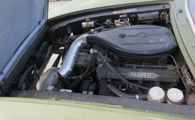 Originally, Maserati’s new GT was meant to be a two-seater, but Giorgetto Giugiaro gave the shell enough interior space to produce the car as a 2+2. This one will require rejuvenation of every $$crevice$$. The back glass is with the car, and a prior owner outfitted the car with wires instead of the standard Campagnolo alloys.