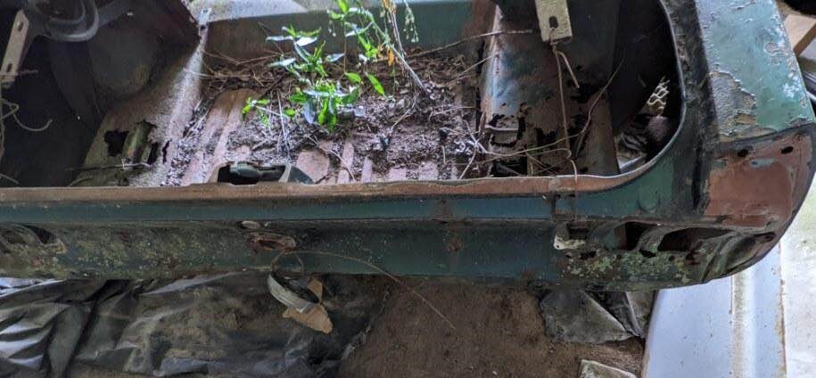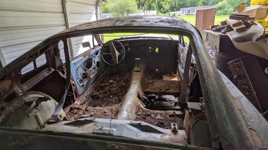 The seller is correct in saying this Mustang needs everything. Most of the good stuff has long since been pirated, such as the engine which could have been a V8 or inline-6 but we don’t know. The seller says the car had an automatic transmission the last time it had one. Other than one door panel, the dash, and the steering wheel, it looks as though none of the interior has survived. The floors have holes in them, and there are surely more elsewhere.