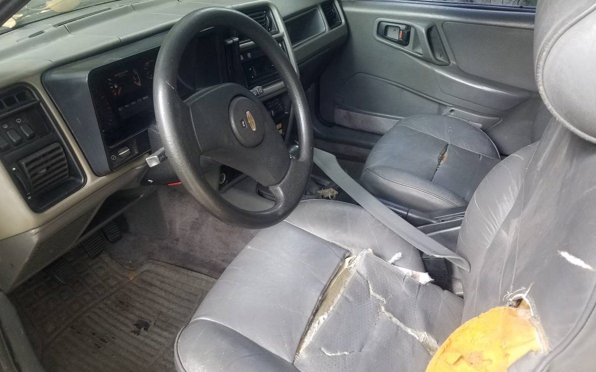 Inside looks like it had a run-in with Sling-Blade, those are some gnarly, trashed leather seats. But they can be reupholstered and the rear one appears to have escaped the same fate. The dash pad is pretty cracked (good luck finding one of those) but the rest of the interior presents itself as reasonable – I wouldn’t say it’s a lost cause.