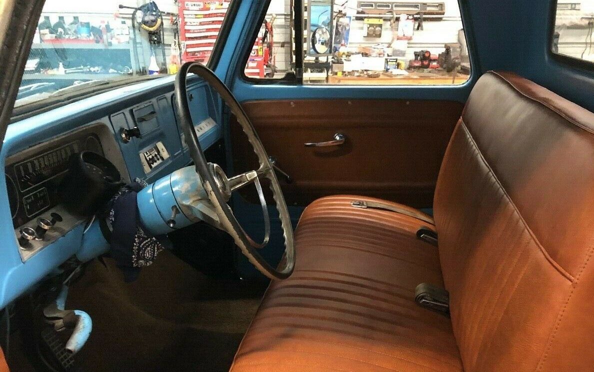 The interior of this truck looks really comfortable. The seat cover and door panels have been done in “whiskey” material. It looks like leather, but the seller doesn’t mention that it is. Besides the upholstery, the gauges have been fixed and work well. You can see the steering wheel is original. There’s a large-face tach mounted on the column, which probably isn’t necessary, but it could be easily removed if the new owner chooses to.