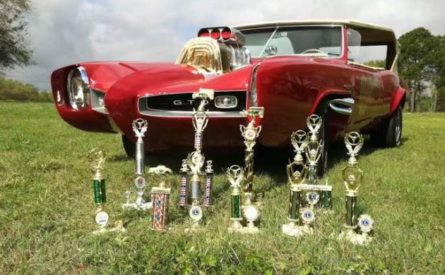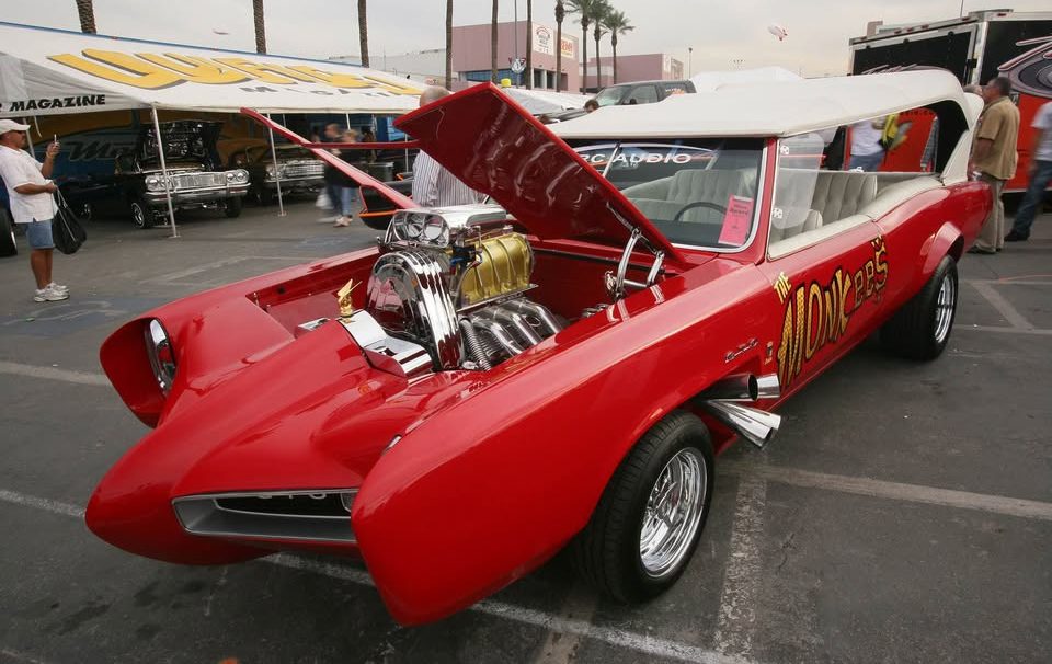 Two base 1966 GTO’s with automatic transmissions were supplied by the Pontiac Motor Division to be converted into Monkeemobiles. In the span of only four weeks, Dean Jeffries and his team created two bright red Monkeemobiles, one for the TV Show and one for touring car shows across the US. The car’s front and rear were both stretched by over a foot, the trunk area was converted to a curved bench seat, a huge canvas top kept the band from getting sunburned, and a GMC 6-71 supercharger atop the GTO’s original 389 four-barrel V8 stuck out of hood. (There was even a rear-mounted parachute.)