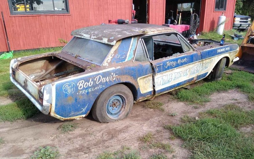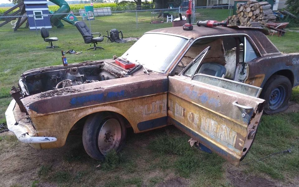 It’s a peculiar juxtaposition finding a stack of cordwood, indoor office chairs, and a ’66 Ford Mustang coupe languishing out in the backyard. So is this Mustang a vestige from a racing past that was discarded and forgotten, or maybe just a dolled-up poser that was discarded and forgotten. It’s hard to say – at least it’s paid off according to its listing! Anyway, let’s take a closer look at this Chesaning, Michigan domiciled Ford. It is available, here on Facebook Marketplace for $1,000. Thanks to Justin for this tip!