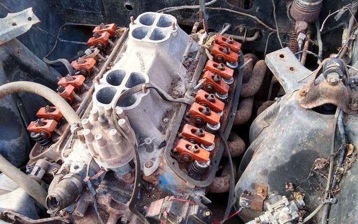 Mechanically, there’s a bit more. The engine, which is referred to as a 289 or a 302 CI V8, is topped with half of an Offenhauser tunnel ram intake – the top box portion is apparently missing. It’s just a guess, but the engine was probably pretty stout with significant internal work back in its day, considering the amount of carburetion employed and the roller rockers that are present. There is a 9-inch differential housing in place but the third member is absent and that’s connected to a Top-Loader four-speed manual transmission which is, in turn, hanging off of a steel bell housing – there’s value in the transmission!