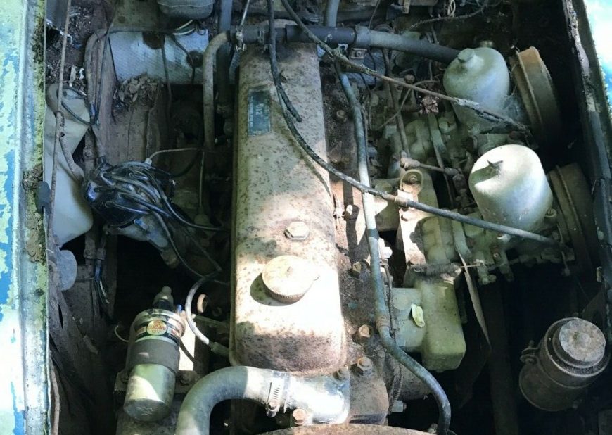 The Healey does come with the valuable hard top, and it’s done some good for protecting the seats and carpet – which look better than I’d expect. Door panels are long gone and surface rust is everywhere. You never can tell from these listings whether a car has been ravaged for parts, but it looks mostly complete from this vantage point. The gauges, steering wheel, and gear stick all look factory correct.