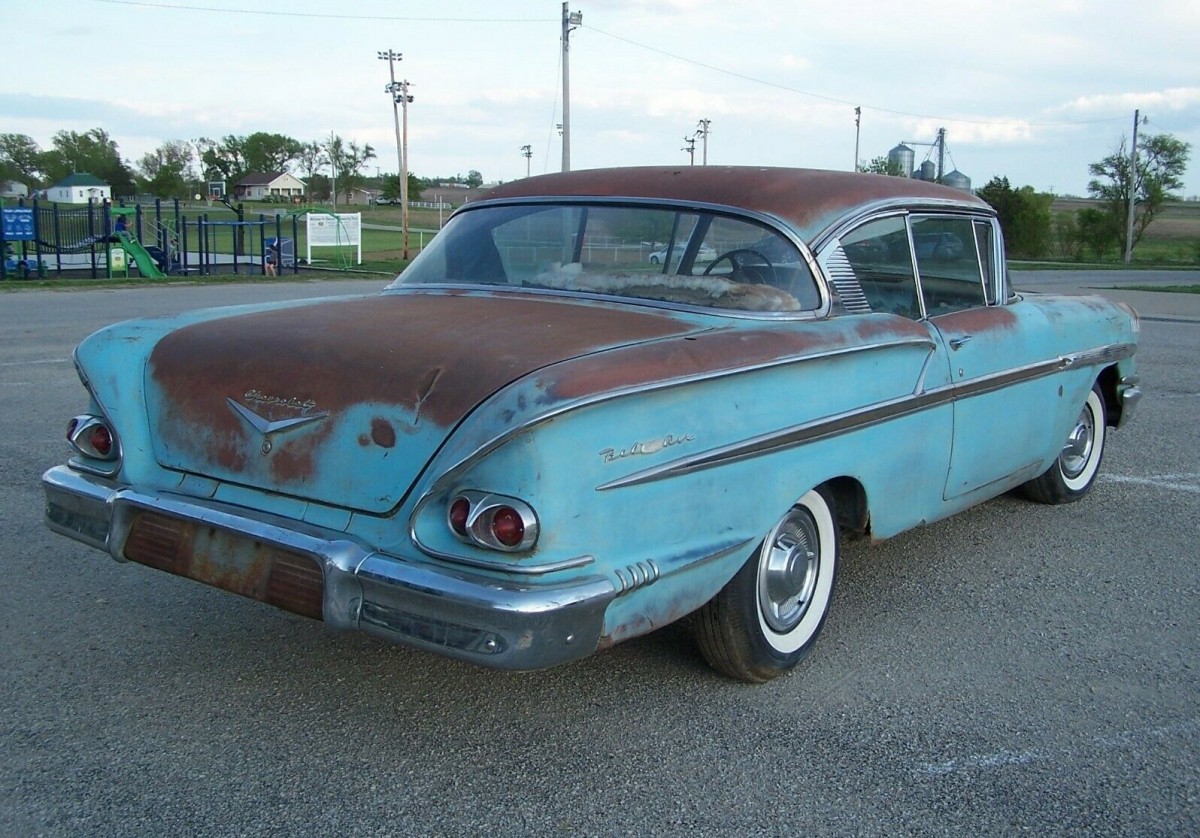 I’m in the minority , but I’ve always thought the 58 Chevy was such a better looking car than the 57 . Looks like this ones been sitting in a Kansas field for many years, but if had sat that long in New England there would be little left of it ! Even as rough as this one is, I hope it gets saved. One thing I noticed is that the left fender molding is on the car, but there are holes drilled underneath it. Maybe the fender was swapped out years ago from a different trim level 58 ?