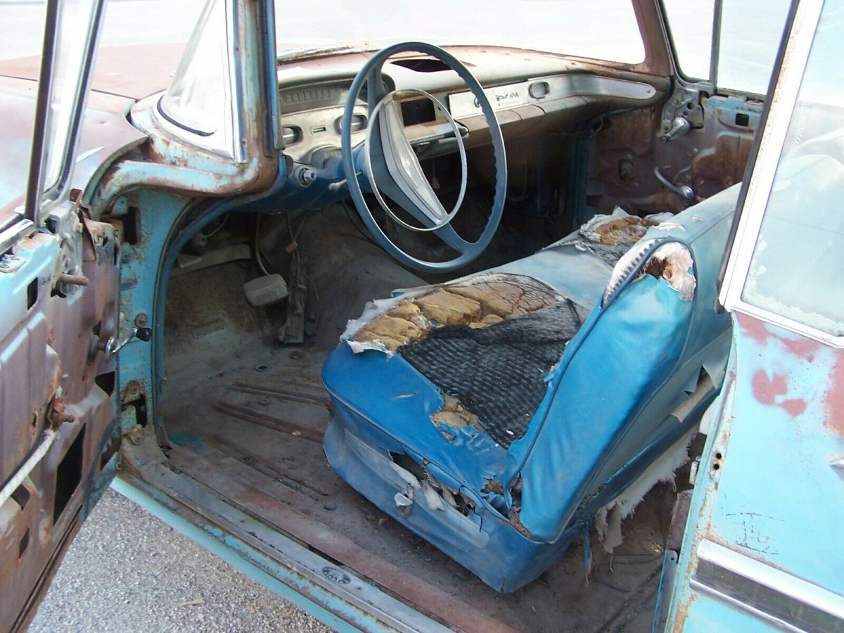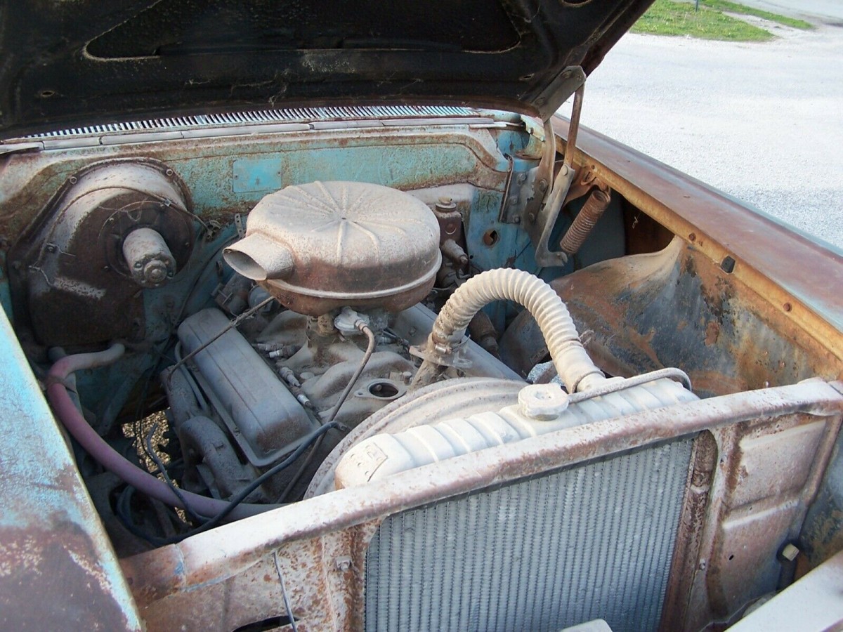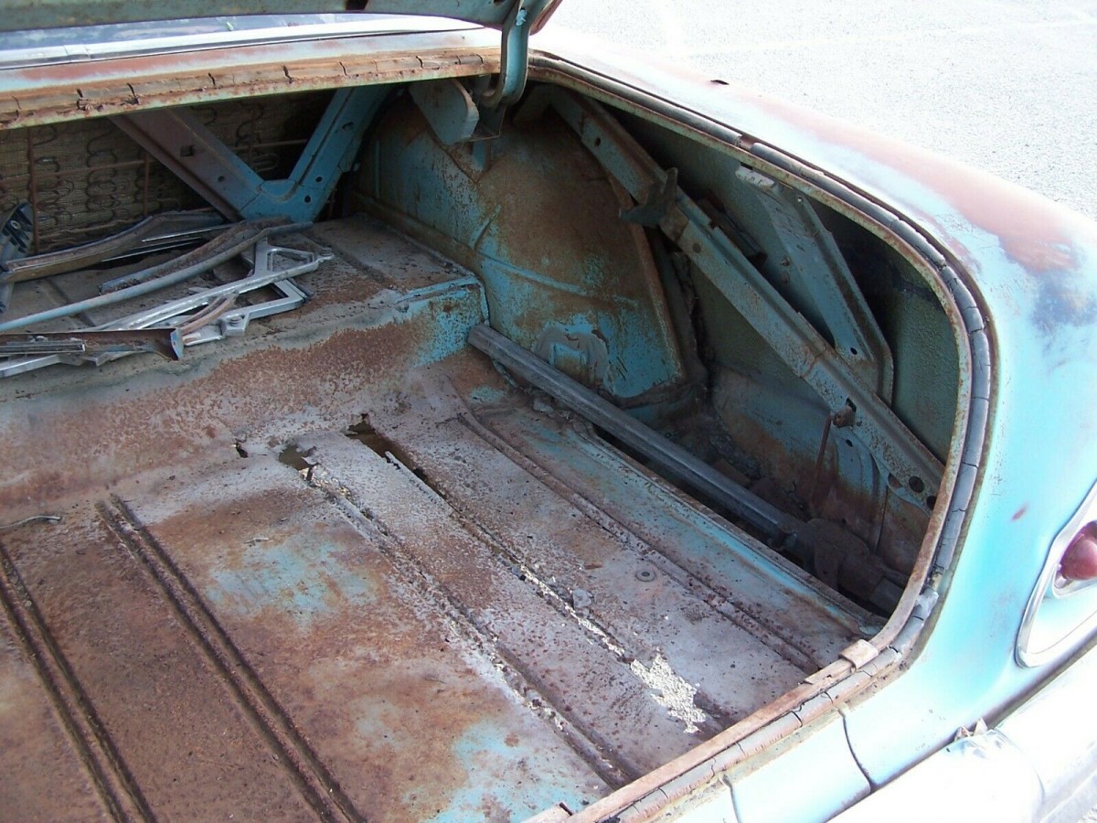 There is rust aplenty on this old car, although we’re told the rockers, fenders, and frame are all good. The rear quarter panels, floor, and trunk floor will all require rust treatment along with the driver’s door on the insides. The interior has pretty much fallen apart and what’s left of the rear seat may have come from a sedan as the seller believes that it’s wider than it should be. Even the metal dashboard has surface rust. So, when you pull everything out to fix the floors, plan on an extreme makeover for the passenger cabin.