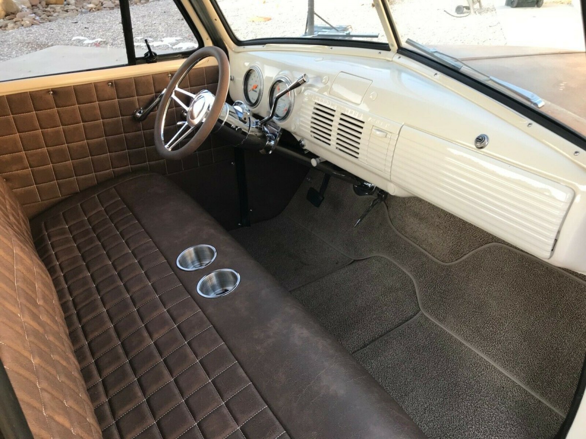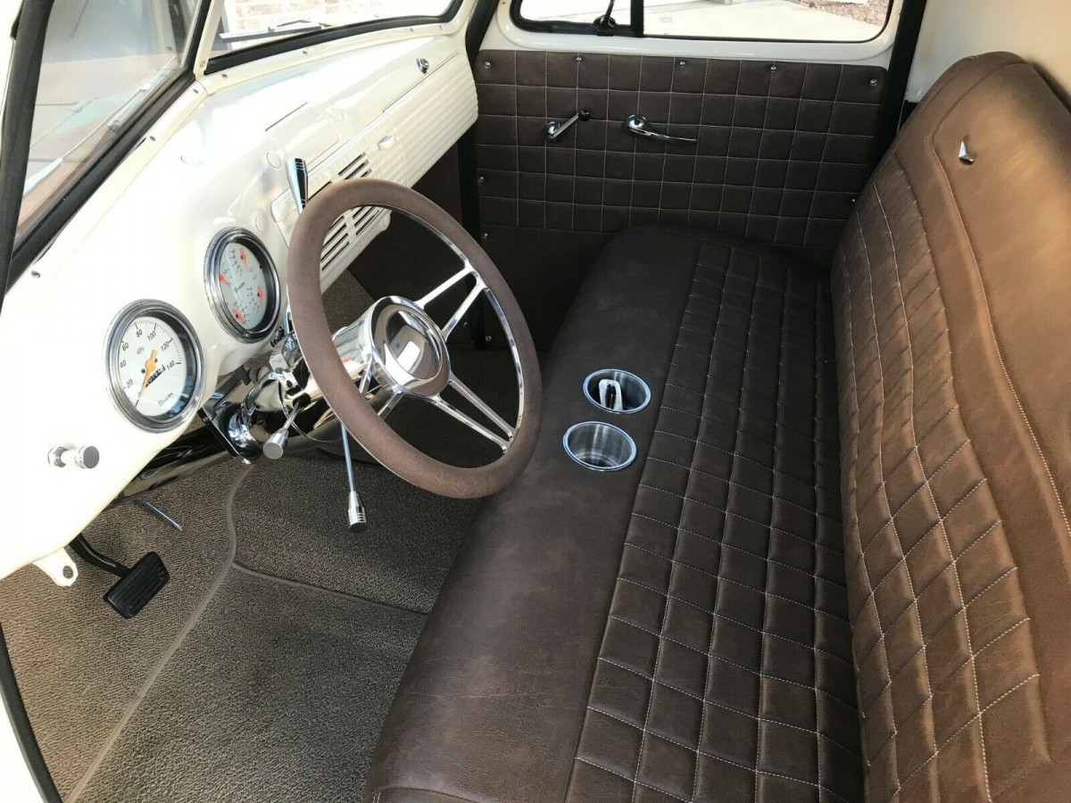 It should be no surprise to learn that under the skin, this is not your ordinary 1951 C-10. The body now rides on a 1996 S-10 frame, and the mounts for this have been laser-cut to allow for a precision fit. This also allows the vehicle to now feature an independent front end, while the vehicle has been slammed to give the C-10 a ground-hugging appearance. The engine bay has been given a tidy-up, with all of the holes in the firewall welded and smoothed. A coat of the same Cornish Cream paint as graces the interior provides a very clean look. Power is derived from the venerable 350ci V8, which sends its power to the rear via a Turbo 350 automatic transmission. The addition of power steering and power front disc brakes make driving the classic Chevy a breeze. The sweet little 350 has been fitted with a tougher cam, an aluminum intake, Holley 650 carb, and a Flowmaster exhaust. The owner supplies this YouTube video, and the engine sounds really clean and strong. Cooling is taken care of by an aluminum radiator and electric fan, while that eye for detail results in the all-new wiring harness being nicely concealed.