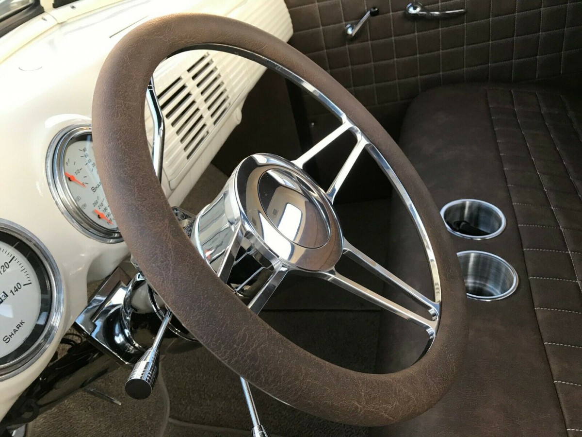 The custom interior of the Pickup is pretty stunning. It all starts with the fact that every painted surface has been refinished in a color called Cornish Cream. The dash is essentially stock, with the exception of a set of vintage-look Shark gauges. These replace the original items and are said to work exactly as they should. The dark brown custom upholstery is faultless and extends from the seat through to the door trims, and the headliner. I talked about the attention to detail, and the spun metal cup-holders fitted to the seat are a perfect example. The steering column has been chromed, and this later-model item also introduces a tilt wheel to the Pickup.