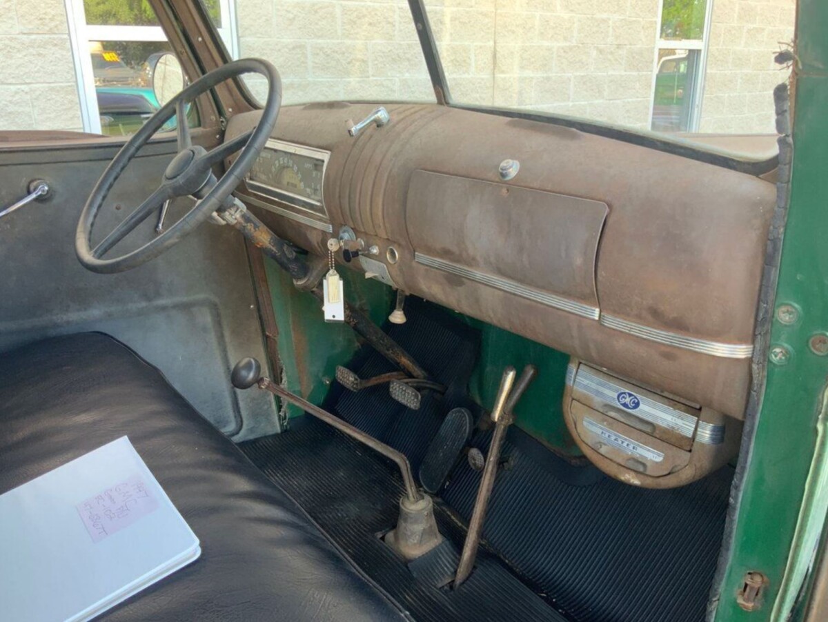 I’ve spent considerable time examining the photos of this Pickup. It isn’t because I was searching for faults but because I genuinely like it. I admit there was a time when I would have largely ignored it, but I now understand the versatility and attraction of these classics. The exterior retains some of its original Seacrest Green paint, although much of it has been consumed by surface corrosion. However, there is no evidence of significant penetrating rust in prone areas like the lower cab corners. The panels have a few scars and marks, but these are repairable. Stripping the exterior to bare metal as part of a restoration or custom build should be straightforward, but preserving its existing character is a valid approach. The seller restored the wheels and fitted wide whitewalls to add a classy touch. The trim looks acceptable for a survivor-grade vehicle, as does the glass.