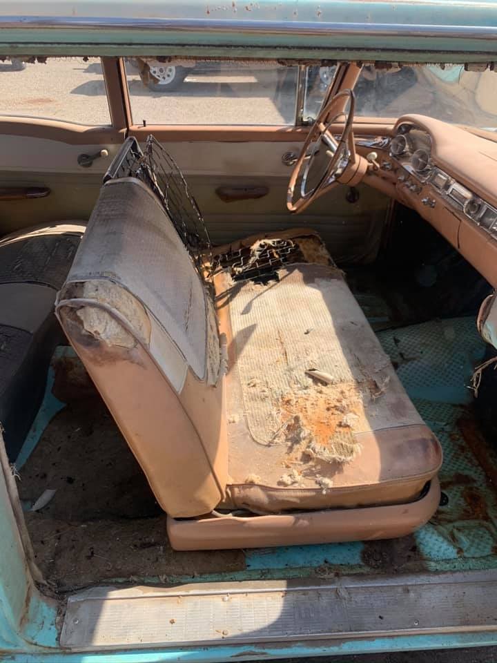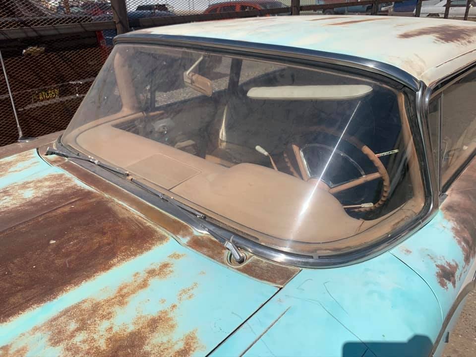 Because of the Edsel’s desert heritage, whatever rust is on the car may be just surface rust. The blue and white paint could very well be original from what we can see. None of the sheet metal looks to be particularly troublesome. The interior will need a fair amount of work, as the seats and door panels will need to be recovered and the carpeting is out of the car, revealing only more surface rust on the floorboards.