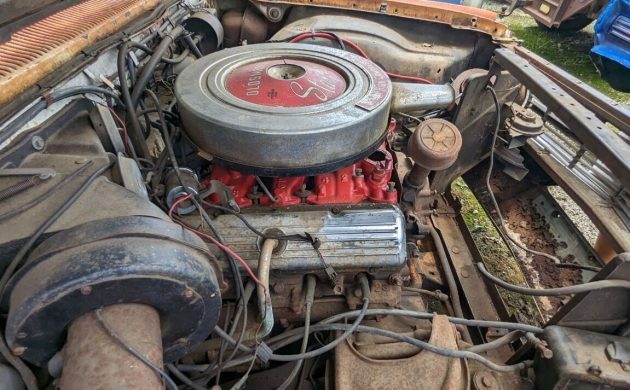 Unfortunately, this one’s missing both front fender extensions and headlight assemblies. However, a quick search on eBay for 1962 Oldsmobile Starfire parts revealed at least 2 extensions for the right side for sale, plus a headlight assembly for the left side. I didn’t scroll through them all, but numerous other components are listed, plus I believe many are the same for the Olds 88 model from that year. It looks like one fender and the lower quarters may have been replaced already, as these don’t match the rest of the car’s patina. It’s sort of hard to tell if most of what we’re seeing on the body is just surface rust, which hopefully it is, but a shot from underneath shows a few holes in the driver’s side rocker, so some metal work and smoothing are in store for the next owner.